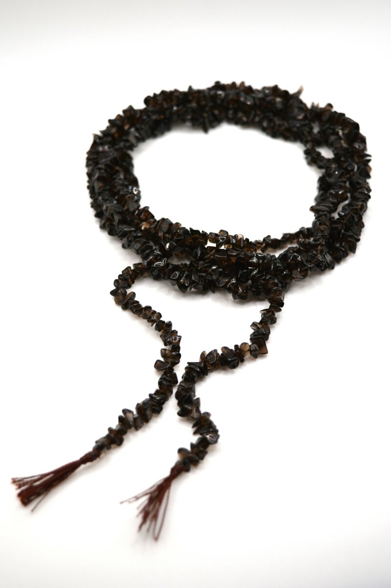Quarzo fumé naturale, taglio chips da 7 mm, montato a mano su filo di seta nera. Nessuna chiusura, ovviamente: si annoda, si avvolge, si lascia andare.